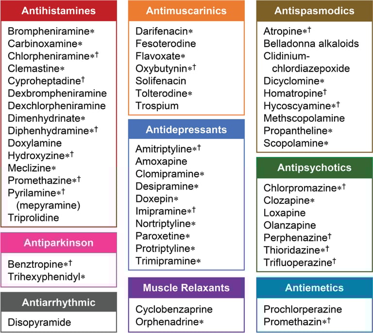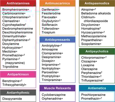 While anticholinergic medications are therapeutic for many conditions, countless medications possess anticholinergic properties that are not responsible for their therapeutic effects and increase the risk of adverse events.